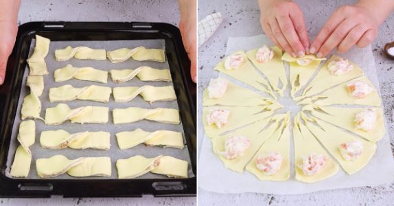 If you are on the search for savory appetizers to serve at your next holiday party, then look no further than these puff pastry appetizers, which have cream cheese fillings mixed with tuna and smoked salmon. There are instructions to make two different puff pastry appetizers with two different fillings and two different methods of assembly.