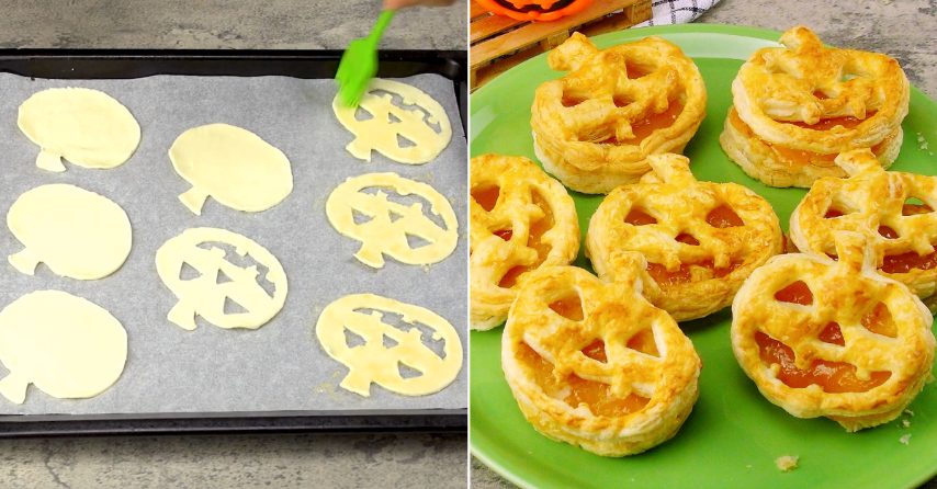 To make the puff pastry pumpkins, puff pastry is cut into pumpkin shapes using a template. Then, faces are cut into half of them before they are brushed with egg and baked in the oven. Finally, they get sandwiched with apricot jam for a sticky and sweet fruit-flavored filling.