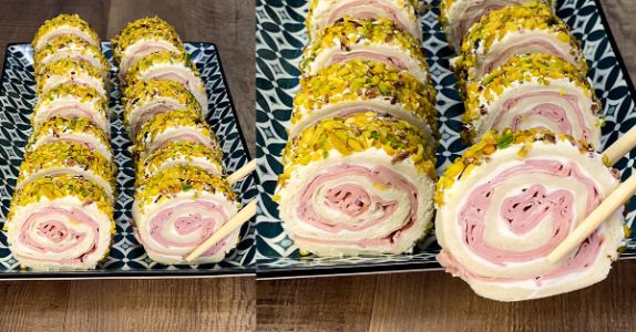 To make the sandwich sushi rolls, sandwich bread is first flattened with a rolling pin before being topped with cream cheese and mortadella, and rolled up into tight rolls. Then, once they are refrigerated, they get coated with cream cheese and pistachios before being sliced into rolls and served. The combination of soft bread, creamy cream cheese, and crunchy nuts makes these sandwiches extra special.