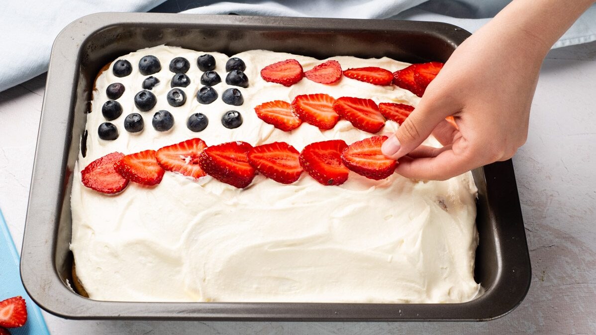 Decorate the cake in a stars and stripes pattern, using the blueberries as the stars and the strawberries as the stripes.