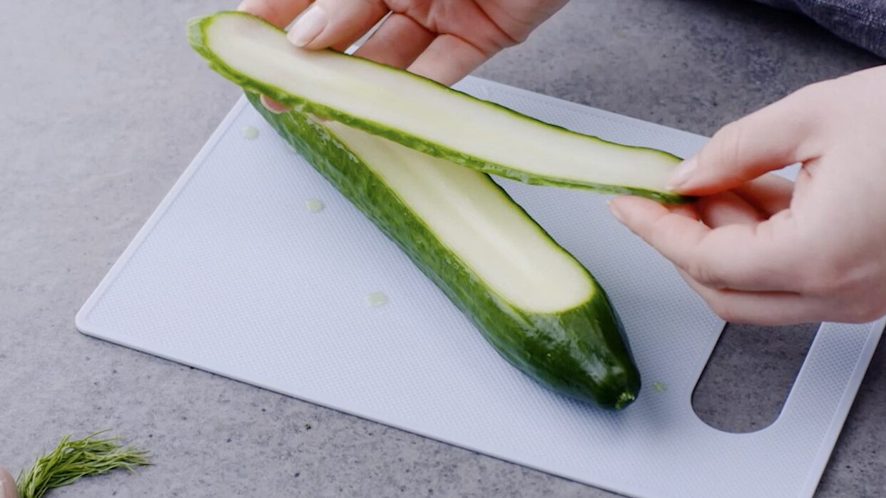 Once the pockets are baked, carefully fill them with the mixture of cream cheese, chopped smoked salmon, dill, and cucumber.