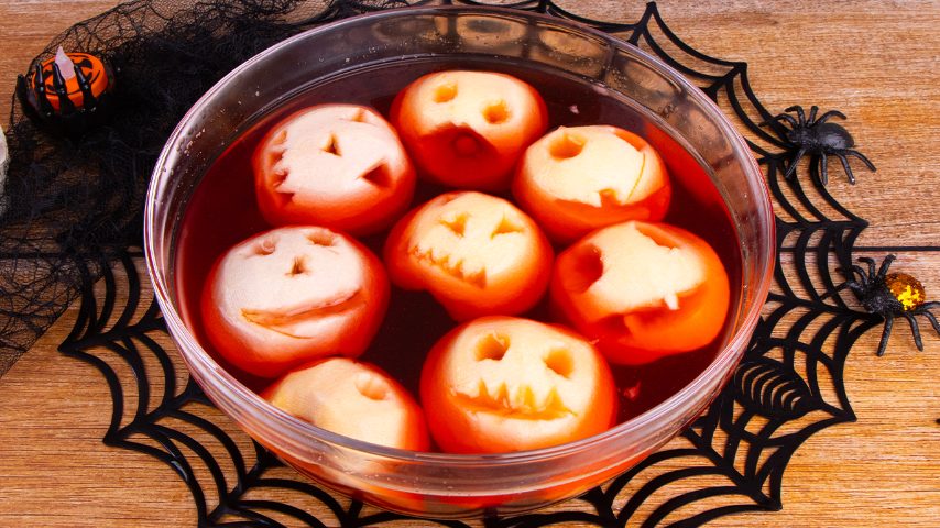 Peel the apples and cut them in half vertically. Using a small knife, carve out eyes, a nose, and a jagged mouth to resemble skulls. Create varied expressions for fun.