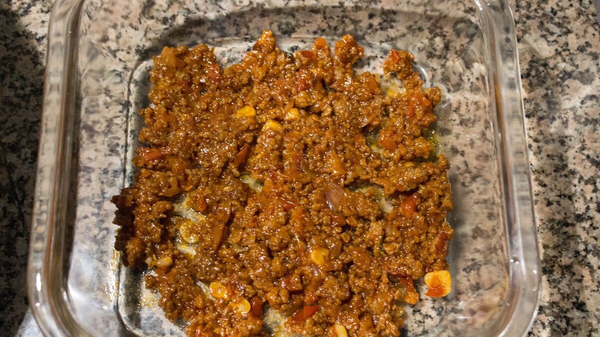 - Now, place a ladleful of mutton mixture at the base of the baking dish.
