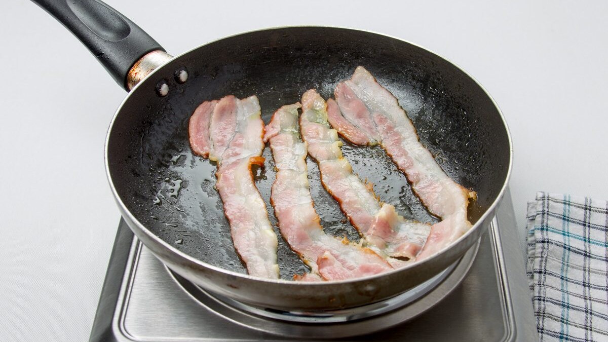 Preserve this mixture. Place a large frying pan on medium heat and add the bacon. When bacon is crunchy retire from heat, extract the bacon from the frying pan and place over absorbent paper to remove some fat.