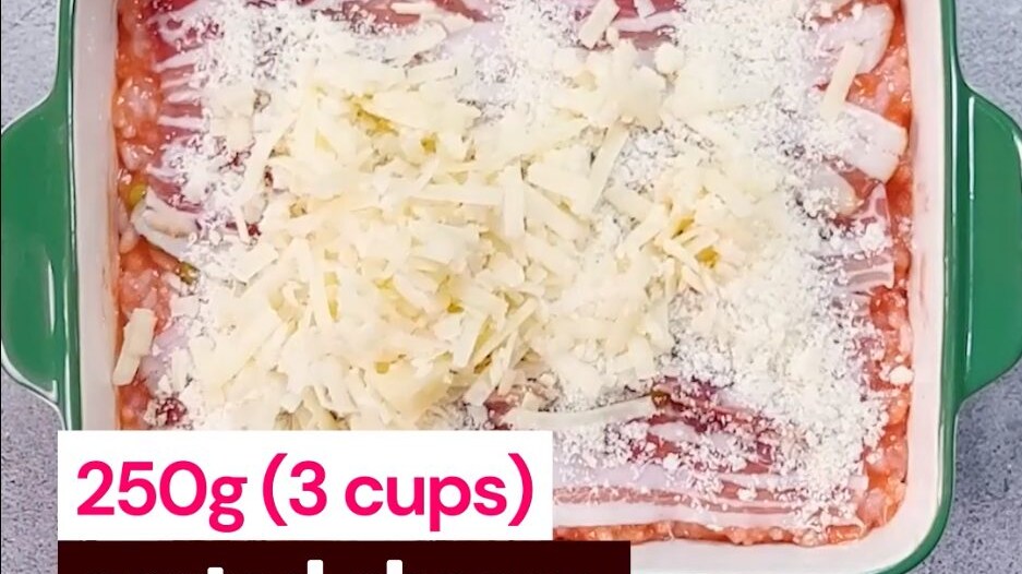 The texture is creamy with a slight crispiness on the outside, and each bit is packed with flavor. To make it, you will need leftover risotto rice, tomato sauce, peas, bacon, cheese, and eggs for binding. Layer the ingredients in an oven-safe baking dish, sprinkle with cheese, and bake!