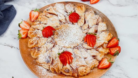 This strawberry sunflower is a four-ingredient dessert containing puff pastry dough, strawberry jam, milk, and an egg yolk. The puff pastry is assembled into a sunflower shape with the jam in between the layers. Sticky and sweet with bright strawberry flavor, this pastry can easily be served as a sweet breakfast or dessert.