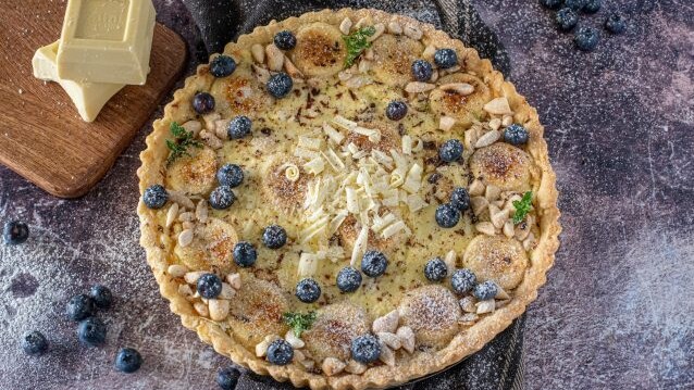 Top the tart with fresh blueberries, chopped almonds and white chocolate curls. Serve and enjoy!