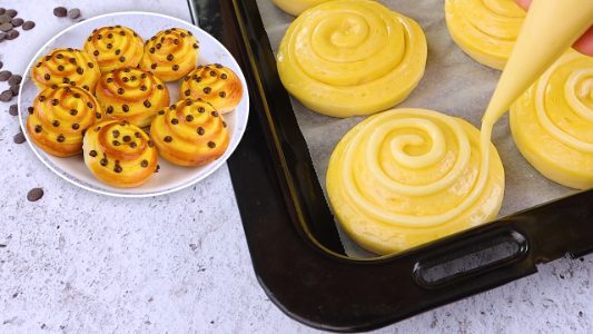 These brioche rolls are special because of how they are assembled; once the dough has been cut into strips, they are rolled up to create spiral-shaped buns and then they are garnished with custard and chocolate chips before they are baked in the oven. The contrast between the chocolate chips, cream, and rich brioche makes these buns so enjoyable to eat for a sweet breakfast, snack, or dessert!
