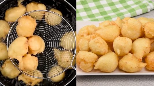 Making the cauliflower fritters requires only a few ingredients; first, you make a batter by mixing flour with water, yeast, salt, and pepper. Then, once you have stirred in the chopped cauliflower, you dollop the batter into hot oil to fry until golden brown. Garnished with some salt, they are soft and fluffy while having a contrasting crisp exterior.