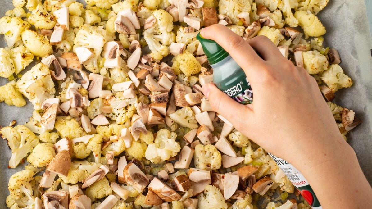 Take the tray out of the oven. Stir the mushrooms into the cauliflower mixture.