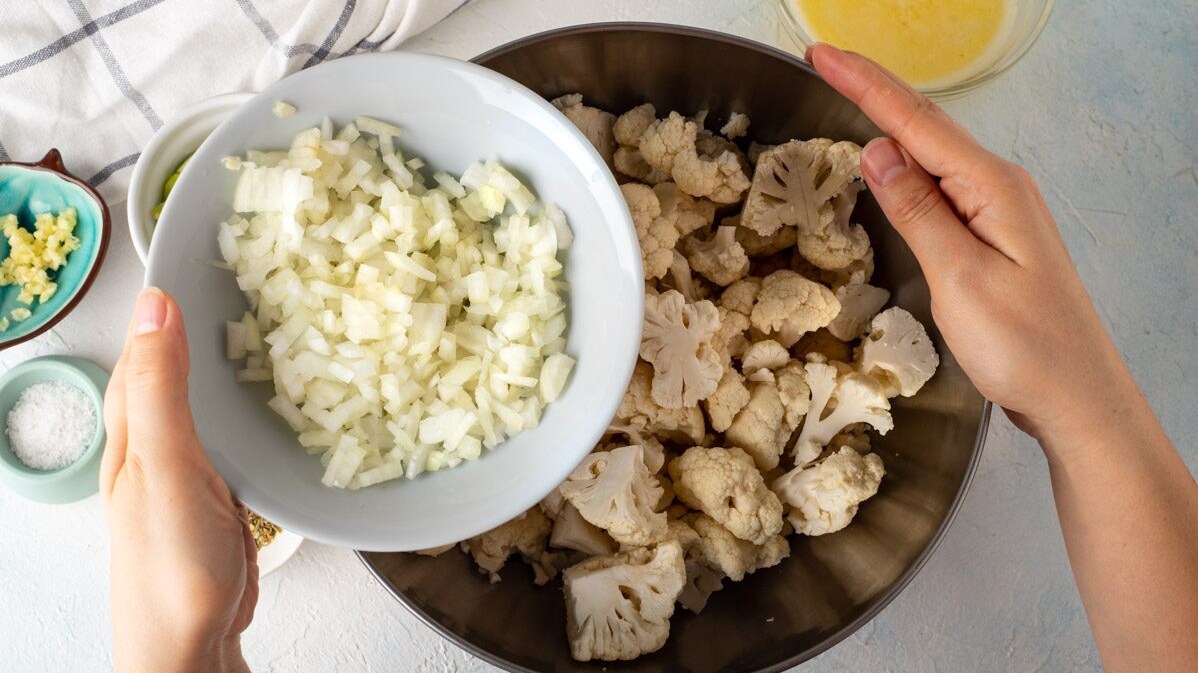 In a large bowl, add the cauliflower.
