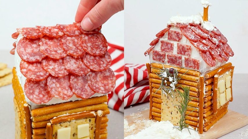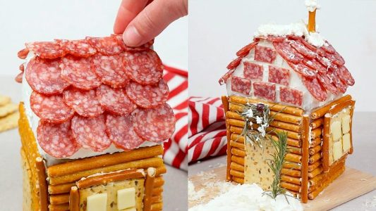 A charcuterie chalet is a festive twist on traditional charcuterie boards, inspired by gingerbread houses and Alpine winter cabins. Instead of sweets, it’s constructed using cured meats, cheeses, crackers, and breadsticks, which are all held together with soft cheese. Think of it as a three-dimensional charcuterie board that celebrates both creativity and good snacking.