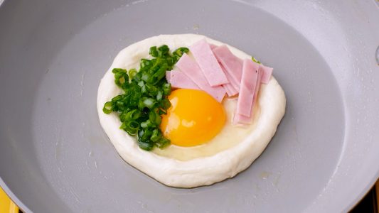 To make the flatbread, you start by making a dough with water, sugar, yeast, flour, and salt. Then, once the dough is allowed to rise, it gets divided into flatbreads. These are then fried in a pan with a topping of egg, ham, and cheese until the bread is golden and the mozzarella cheese is oozing.