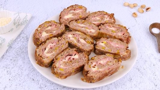 To make the mortadella pistachio meatloaf, you begin by combining ground meat with soaked bread, parmesan, onion, egg, pepper, salt, pepper, pistachios, and breadcrumbs. Then, the mixture gets patted into a rectangle shape on parchment paper before being topped with mortadella and cheese, and rolled up into a roll. Once cooked, sliced, and served, you will be able to see the layers of oozing cheese and mortadella in the meatloaf’s center.