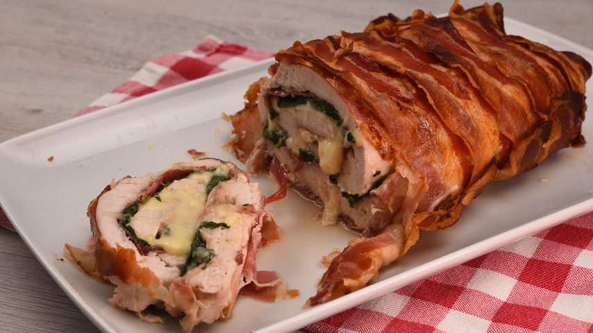 - Drain or wring cooked spinach thoroughly so the filling doesn’t water-log the turkey. Patting the turkey dry before assembling helps the bacon adhere and the exterior brown.