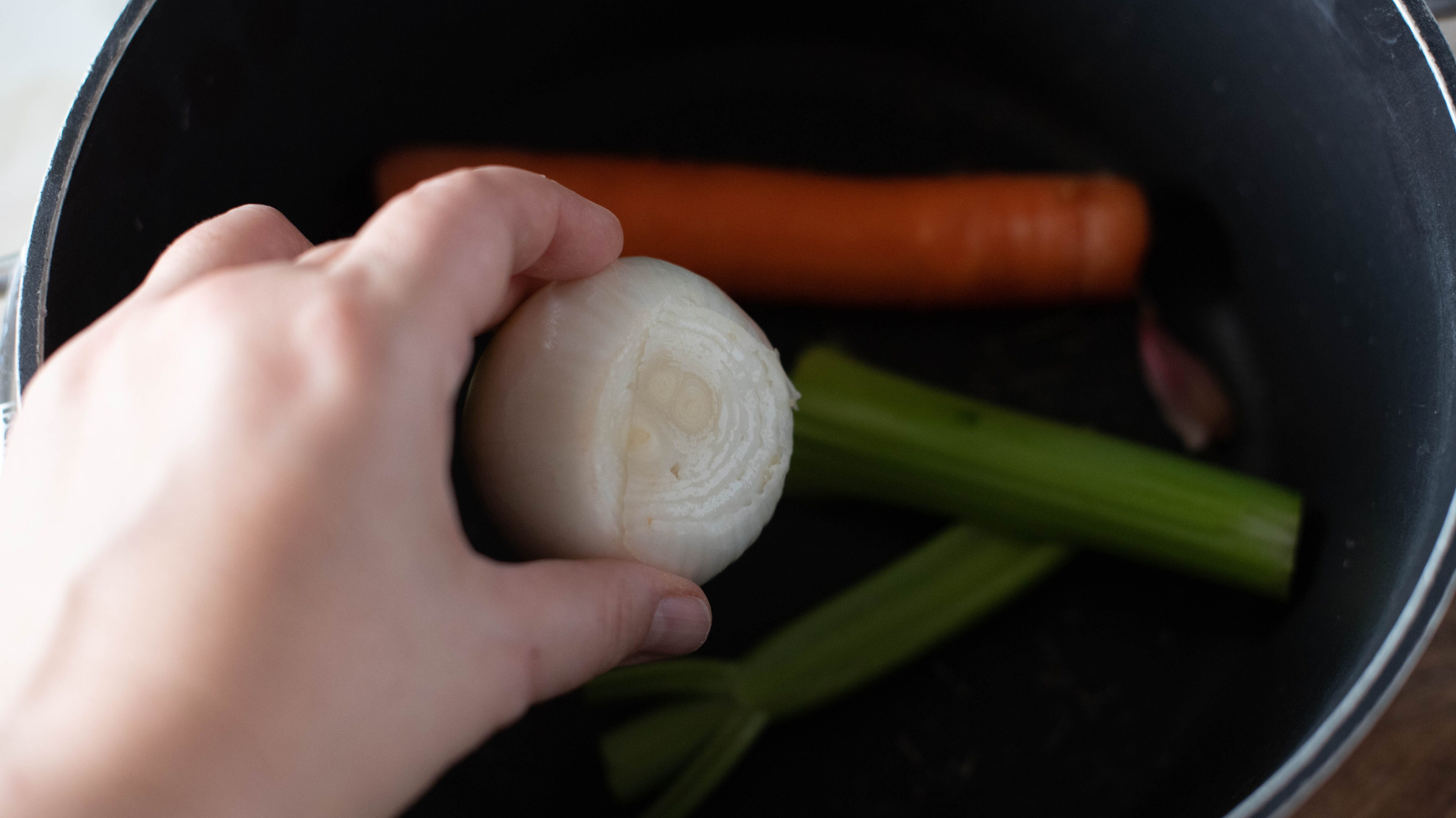 Wash and clean the onion. You can also leave the peel, which will give the broth a nice golden color.