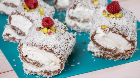 If you like a good Swiss roll, then you’ll love these no-bake chocolate coconut rolls. It’s an easy, no-bake dessert recipe, with flavors and texture similar to that of a classic Swiss roll, but in miniature form.
