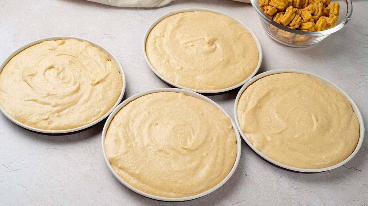 Preheat your oven to 350F. Line three cake pans with parchment paper, then spray with cooking spray. Set aside.