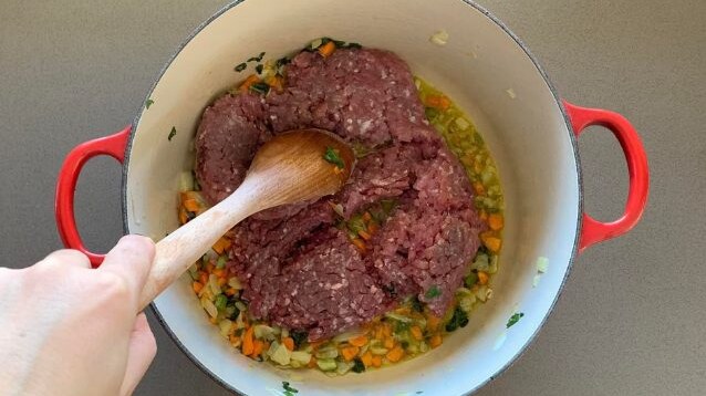 As soon as the vegetables are wilted and slightly golden, add the minced meat, then raise the heat and brown for a few minutes.