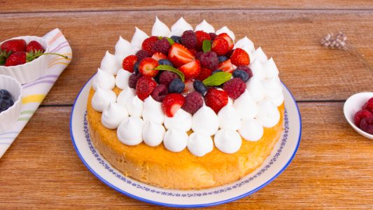 Pipe small tufts of whipped cream over the chilled cake and decorate with raspberries, strawberries, and blueberries. Slice, serve, and enjoy every creamy bite.