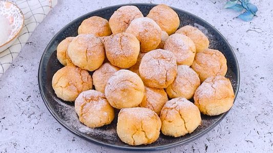 To make the coconut cookies, you begin by making a dough with eggs, sugar, vanilla sugar, and coconut flour. Then, the dough gets divided into round cookies before being baked in the oven. Dusted with icing sugar, they are a simple yet delicious and elegant cookie.