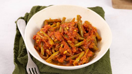 Stewed green beans are a traditional dish in many Mediterranean kitchens, especially in Italian home cooking. The beans are slowly simmered in tomato sauce with aromatics and sometimes cured meats like pancetta.