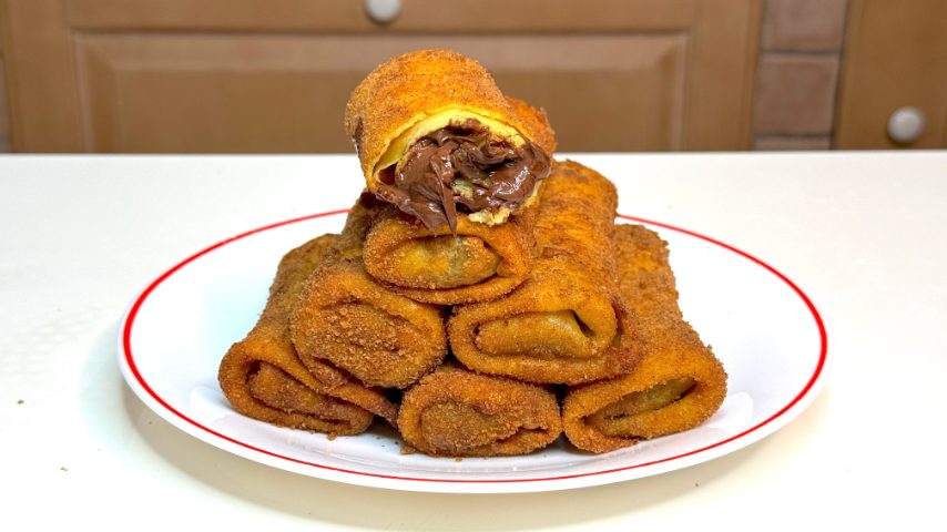 Crunchy crepes are a delicious reinvention of regular crepes — soft on the inside, crisp on the outside. Once cooked and filled, they’re coated in crushed cookies and fried until golden and flaky. The contrast between the velvety hazelnut center and the crispy coating makes them absolutely irresistible.
