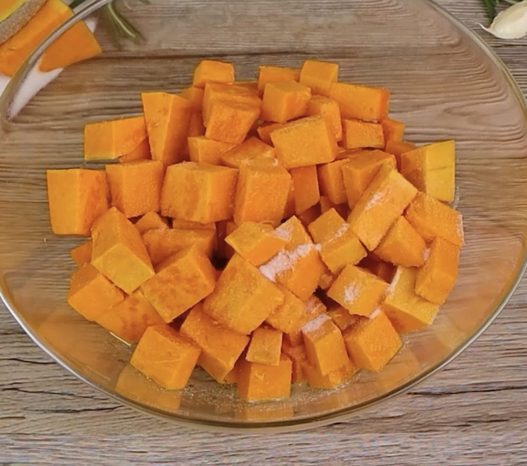 In a separate bowl, toss pumpkin cubes with olive oil to coat evenly.