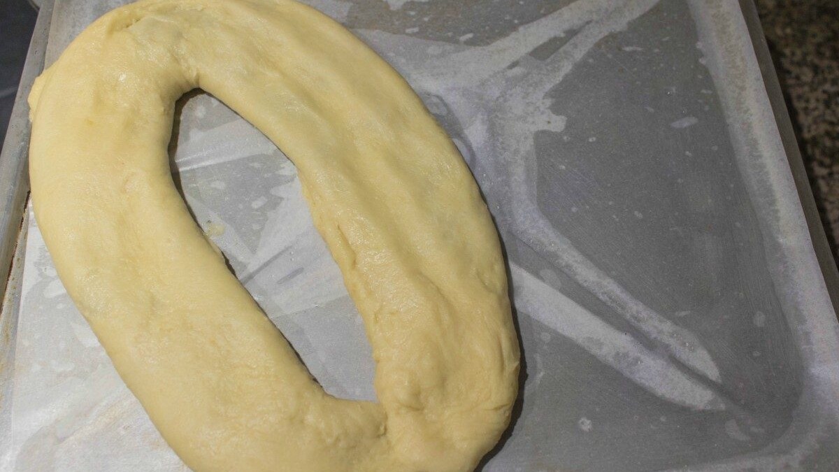 Again fold the long end of the rectangle towards the center 1/3rd and again flip the remaining 1/3rd over the previous fold so that the dough is now shaped in to a square. Cover the dough and chill for about 30 minutes. Roll the chilled dough again to a rectangle of about 12” by 8”. Spread the remaining softened butter over this rectangle and repeat the folding steps to again form a square of the folded layered dough. Cover and refrigerate the dough again for 1 hour. Meanwhile, make the filling by mixing brown sugar, salted butter, and cinnamon powder until well combined. Cut the dough in to 2 equal parts. Now roll the dough again on a lightly floured surface to a rectangle of about 25” by 6”. Spread half of the filling in the middle of the rolled rectangle in a thick line while leaving about 1 inch from all the sides of the rolled rectangle. Now fold 1 long end of the rolled dough towards the middle. Moisten the folded long end with water and fold the other long end to cover the moistened dough layer to cover at the top. Seal the sides of the long roll strips at the edges and pinch the folded dough layer to seal it from all sides. Lightly grease a baking tray and then layer it with a butter paper. Now, place the dough log over the baking tray in an oval shape by joining the two ends together.