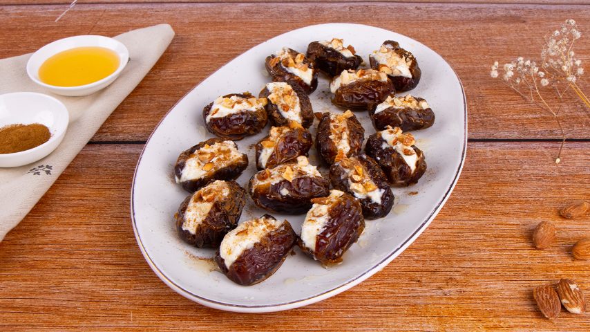 Stuffed dates are dried dates that are filled with cheese and garnished with chopped almonds, cinnamon, and honey. These have a sweet flavor profile making them perfect for those who have a sweet tooth. The cheeses used for this recipe are mascarpone cheese and goat cheese, which are both incredibly creamy although they have contrasting flavors with the mascarpone being milkier and sweeter, and the goat cheese being tangier.