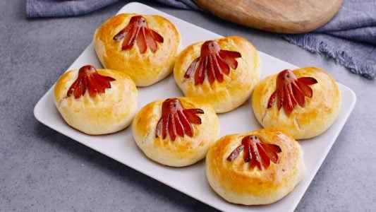 Brioche with sausage octopus is a fluffy, enriched bread roll that wraps around a sausage that’s been trimmed into legs, so it opens up like an octopus while baking. The dough is soft and slightly sweet, which makes it a kid magnet, especially when the sausages look like little characters. It’s a popular party-style snack in many home kitchens because it’s easy to portion and fun to serve.