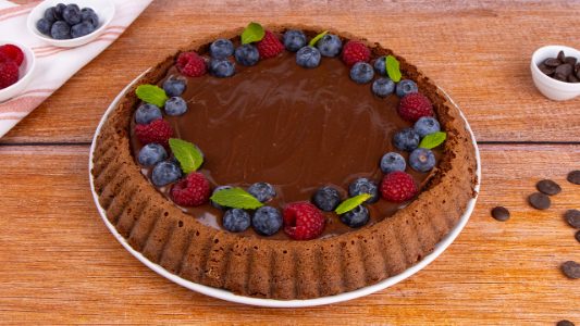 This soft chocolate tart recipe is rich with a chocolate ganache filling and a spongy and cakey “tart” shell. Garnished with fresh raspberries and blueberries, this chocolate tart makes a decadent dessert that every chocolate lover will enjoy!