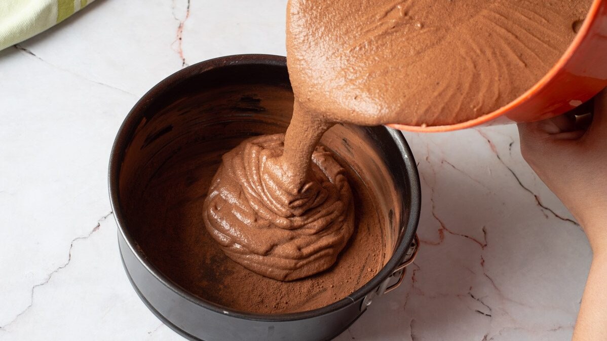 Dust the bottom and sides of a pan with extra cocoa powder.