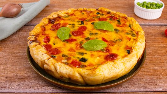 Veggie pie, also called a quiche-like pie, is a pastry dish in which cooked vegetables and a seasoned egg-and-cheese custard are baked inside a pastry crust. It borrows from quiche traditions but uses puff pastry for a lighter shell and a generous vegetable-forward filling. This version highlights Mediterranean flavors, basil, and cherry tomatoes, with everyday vegetables and easy supermarket ingredients.