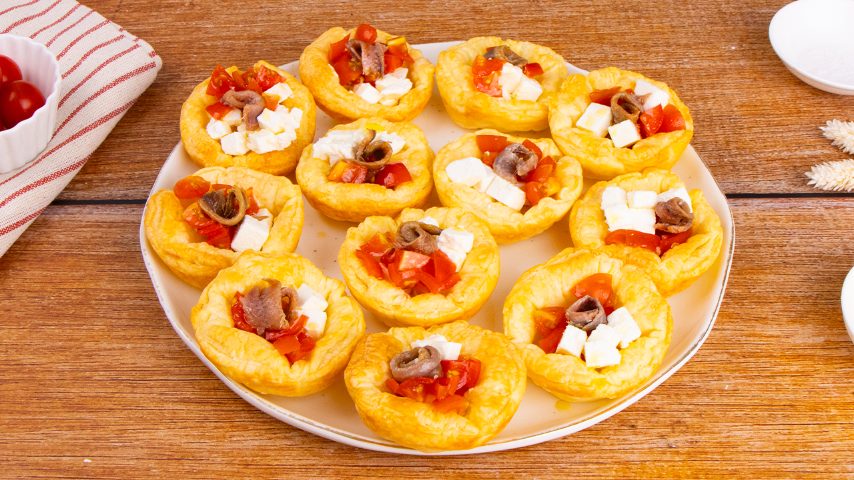 Fill each baked puff pastry base with crumbled feta, cherry tomatoes, and anchovies. Arrange them neatly on a serving dish.