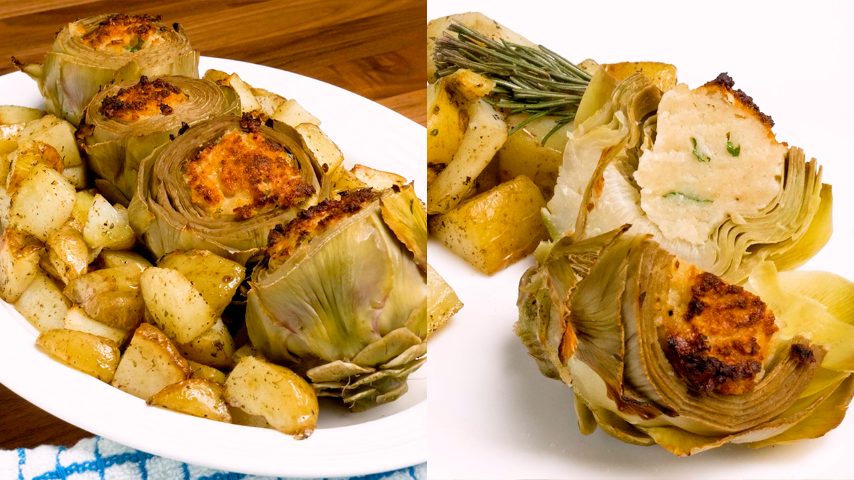 To make the stuffed artichokes, the artichokes are boiled before being stuffed with a cheesy breadcrumb mixture and roasted in the oven with potatoes. Then, in about a half hour or so, you will have dinner ready to enjoy!