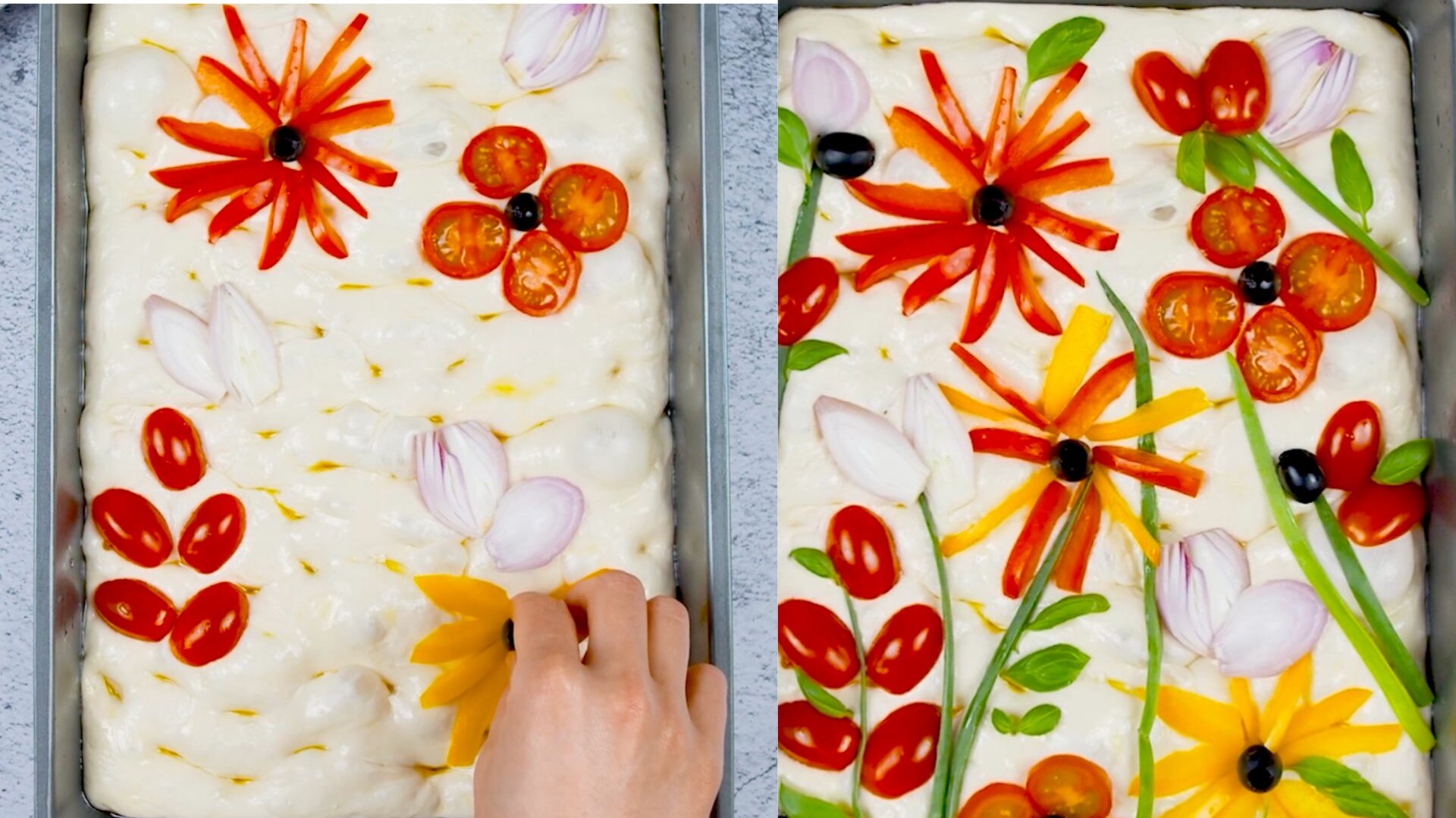 Flower focaccia is all about creativity. Alongside bell peppers, cherry tomatoes, and olives, you can use zucchini slices, red onion rings, or even edible flowers like nasturtiums or pansies. Adding seeds like sesame or sunflower seeds can also give an extra crunch and visual appeal.