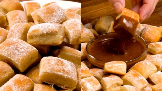 This bread cubes with chocolate sauce recipe is just how it sounds. You make homemade bread that is cut into cubes but the bread is lightly sweetened with sugar and dusted with powdered sugar before serving. Paired with a chocolate dipping sauce, the powdered sugar-coated bread cubes are almost donut-like and so delicious!