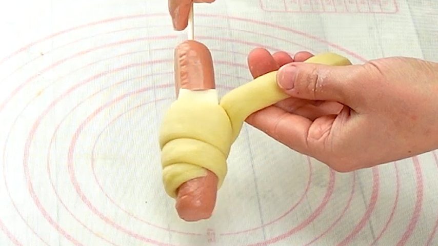 Wrap each sausage skewer with a strip of dough. Place on a baking tray, cover lightly, and let them rest for 20 minutes.
