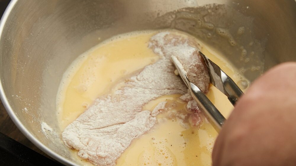 Pour the egg mixture over the breast, then press each chicken breast into the flour to coat them.