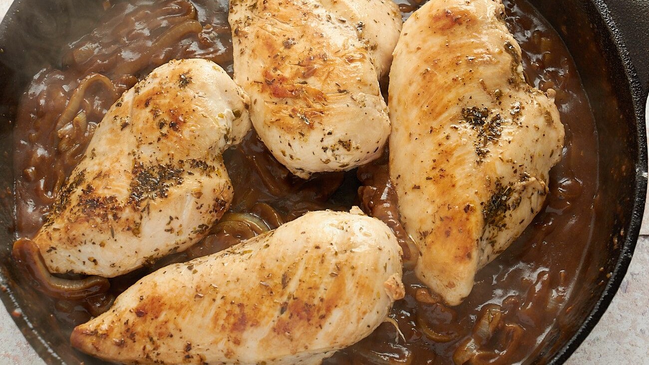 The pan-seared chicken breasts are smothered in caramelized onions and topped with three different types of melty cheese before being finished off in the oven – and the whole thing only takes around 30 minutes to make!