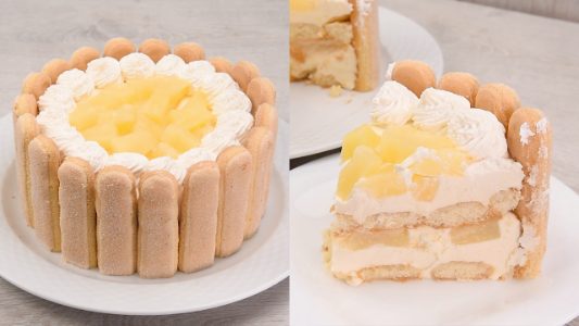 Unlike baked cakes, this version is refrigerated rather than baked. The ladyfingers soften gently from pineapple juice, while the homemade custard and whipped cream create a great filling. The pineapple adds freshness and subtle tang, making every bite delicately sweet.