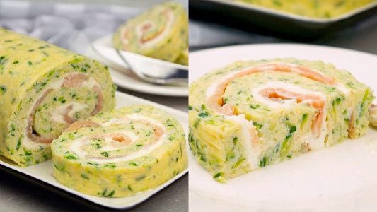 Some dishes feel like they belong on a brunch table with sunlight and a sharp knife. This omelette combines a baked zucchini-Parmesan omelette sheet, cream cheese, and smoked salmon. It’s fresh but satisfying, and can be enjoyed during breakfast or brunch.