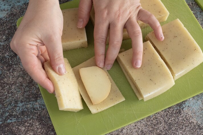 Stuff the slices of cornmeal mush with smoked scamorza cheese (6).