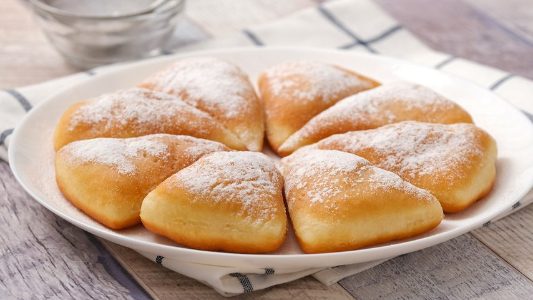 To make the fried sweet bread, you first make a dough with flour, egg, sunflower oil, yeast, sugar, baking powder, salt, and water. Then, once it has risen, it gets rolled out and cut into triangles before being fried in hot oil. Piping hot from being fried, this sweet bread recipe is simply irresistible!