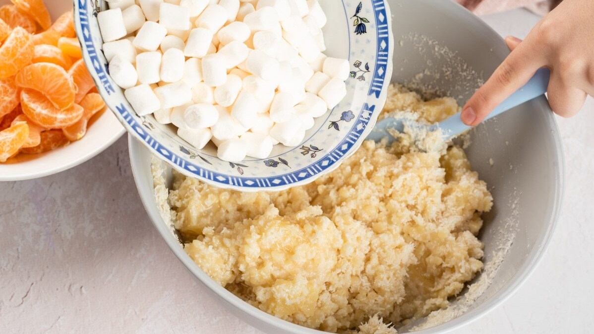 Mandarin oranges, pineapple tidbits, crushed pineapple, shredded coconut, and marshmallows add texture and sweetness to the pasta salad.