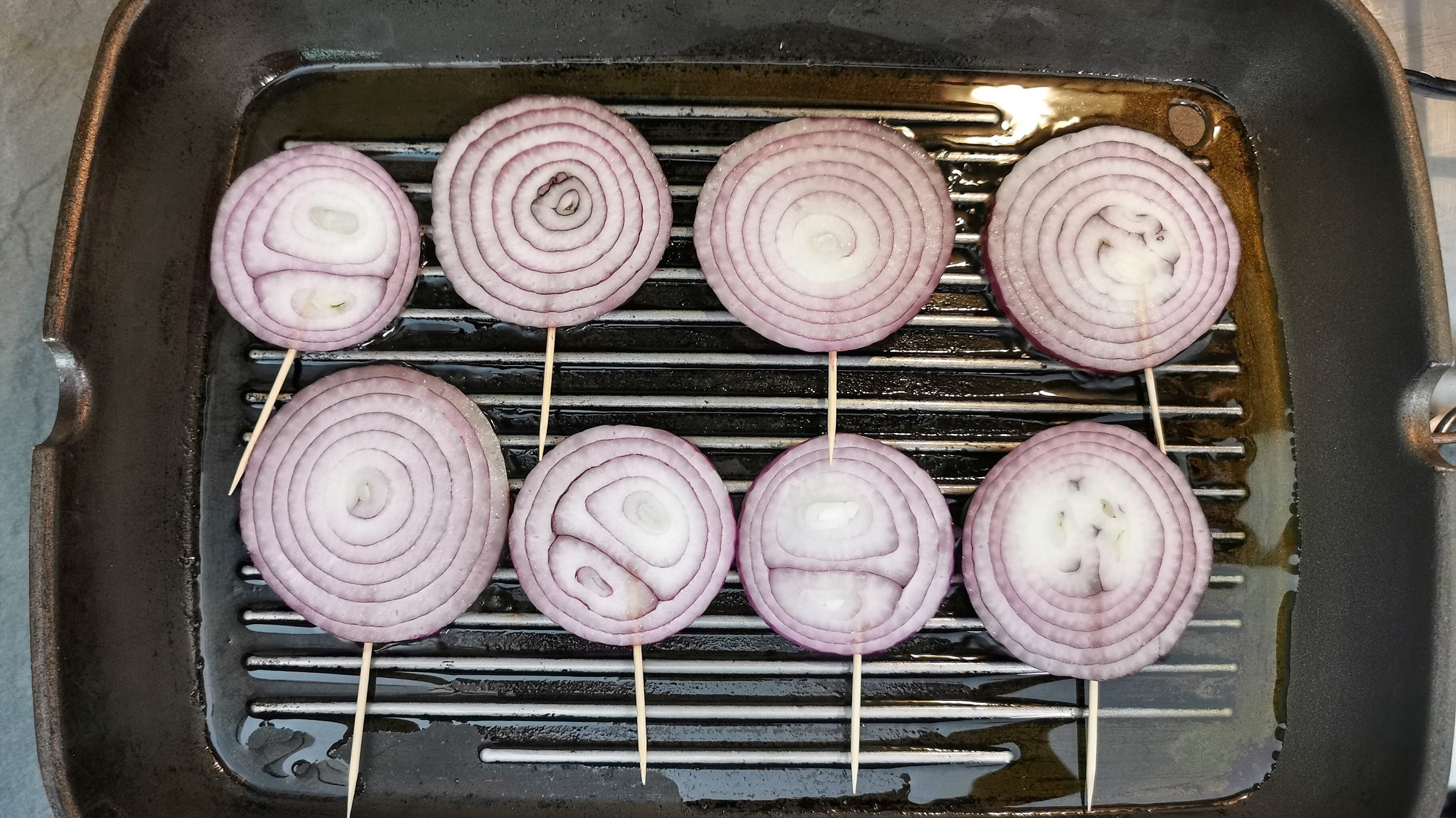 Grease a grill well and put it on the fire; once hot, arrange the onions 2 and grill them for 3 minutes; turn them gently with the help of the toothpick and continue cooking for another 3 minutes.