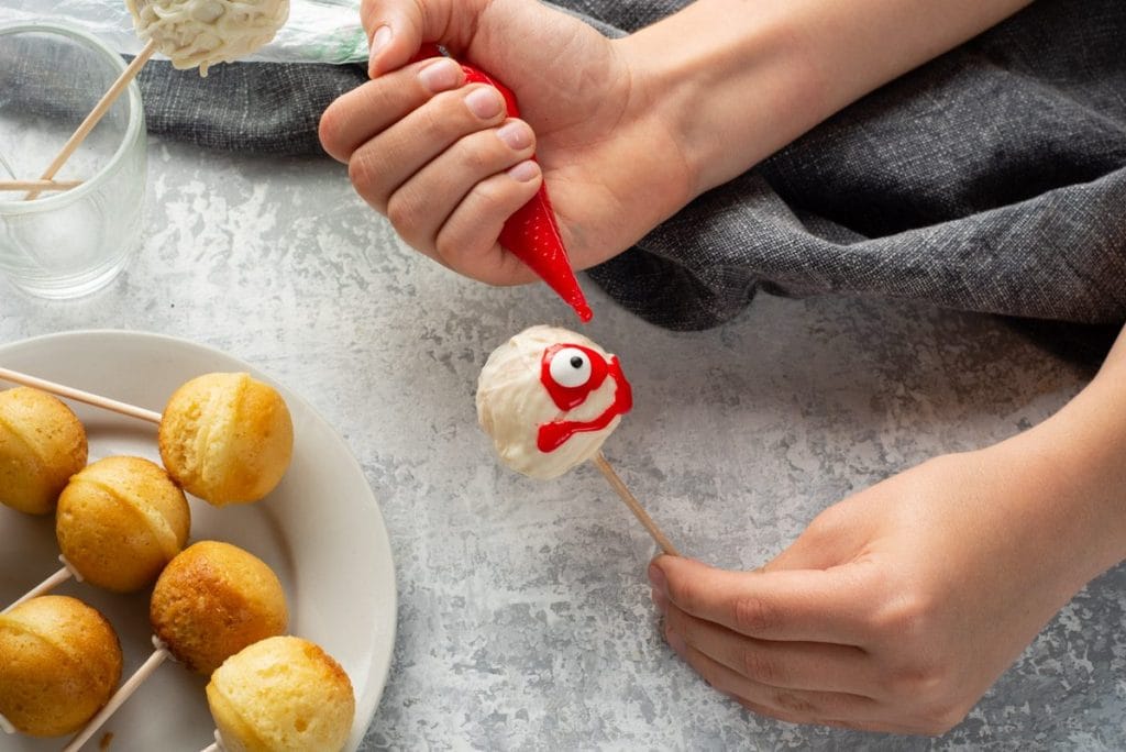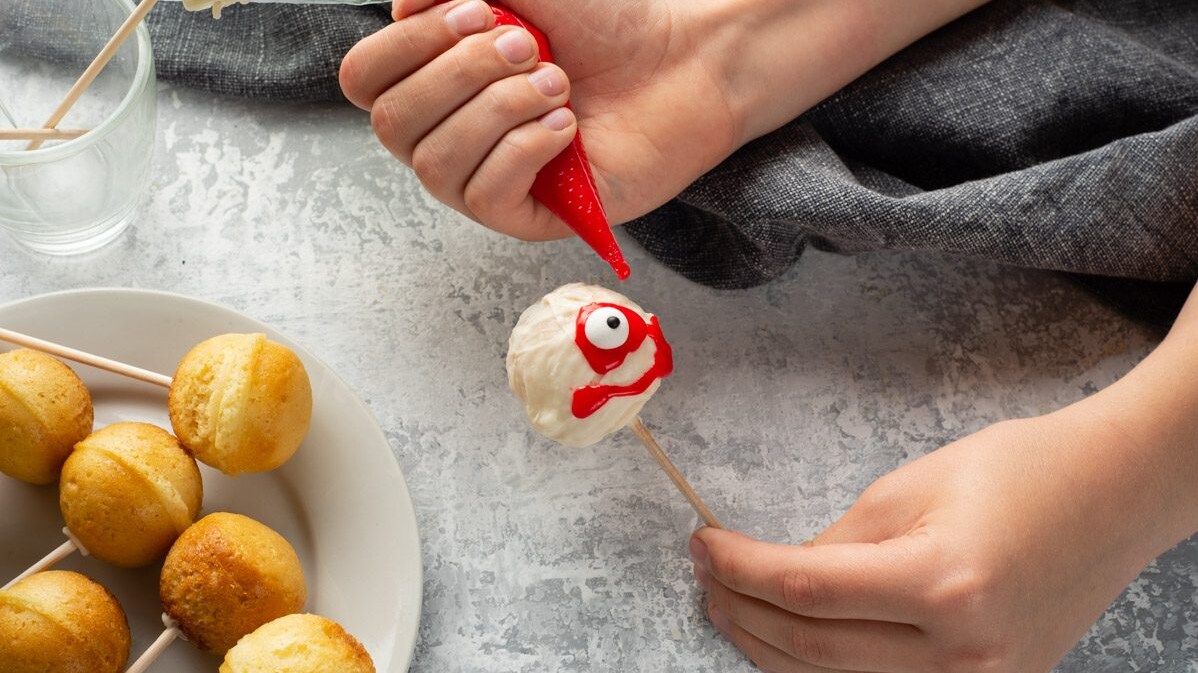 For making cake pop eyeballs, add a eye candy and surround it with melted red candy melts to make them look bloody.