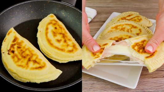 To begin making the pan-fried panzerotti, you begin by making a dough with flour, baking powder, salt, olive oil, and water. Then, once it has been kneaded, it gets divided into four portions and each one is rolled out into a circle and topped with slices of ham and cheese. Next, the entire circles get folded in half to form half moon shapes and then the edges are sealed so that the filling doesn’t come out. Finally, you pan fry them on both sides until they are golden, which makes them a healthier choice than traditional panzerotti that are fried in hot oil.