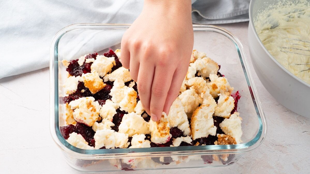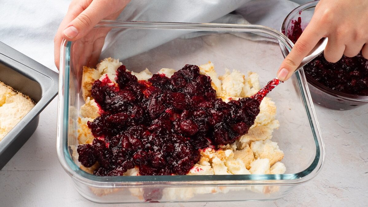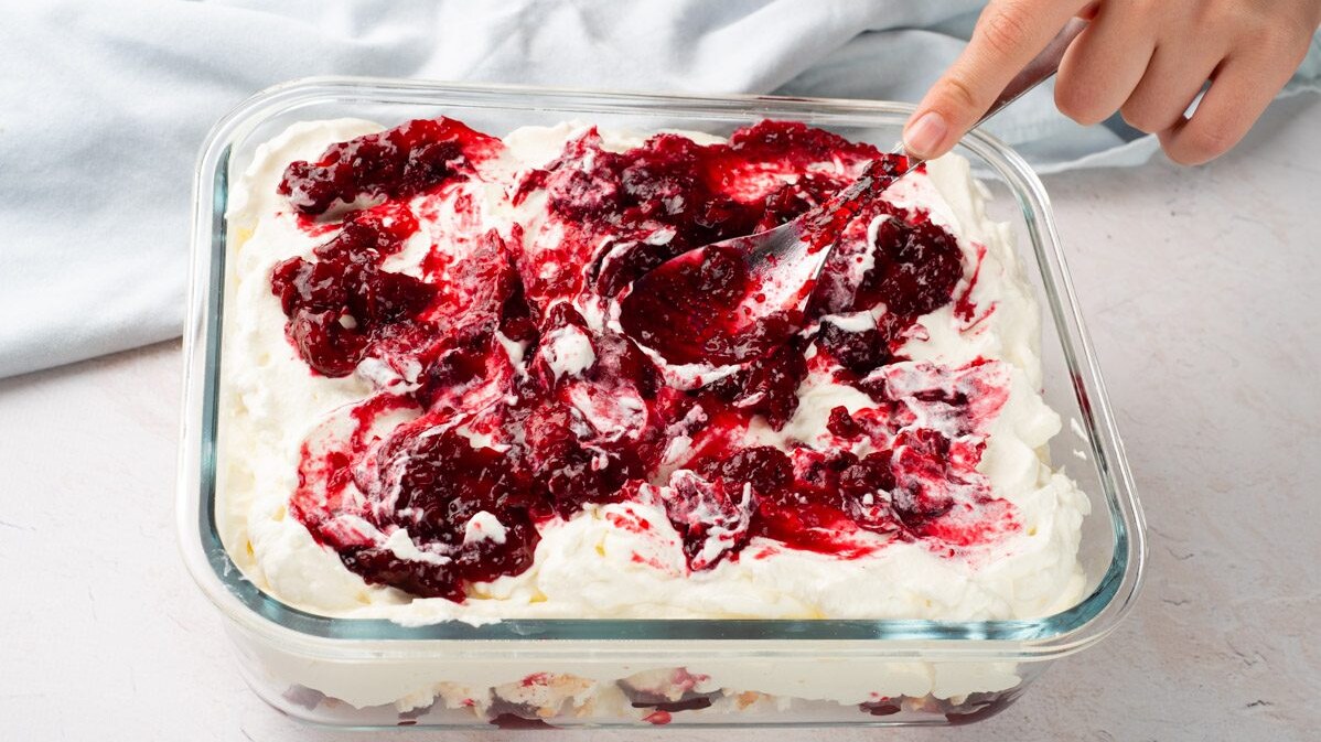 Cover with the remaining cherry pie filling. Leave the cake in the fridge for 4 to 5 hours or overnight to chill before serving.